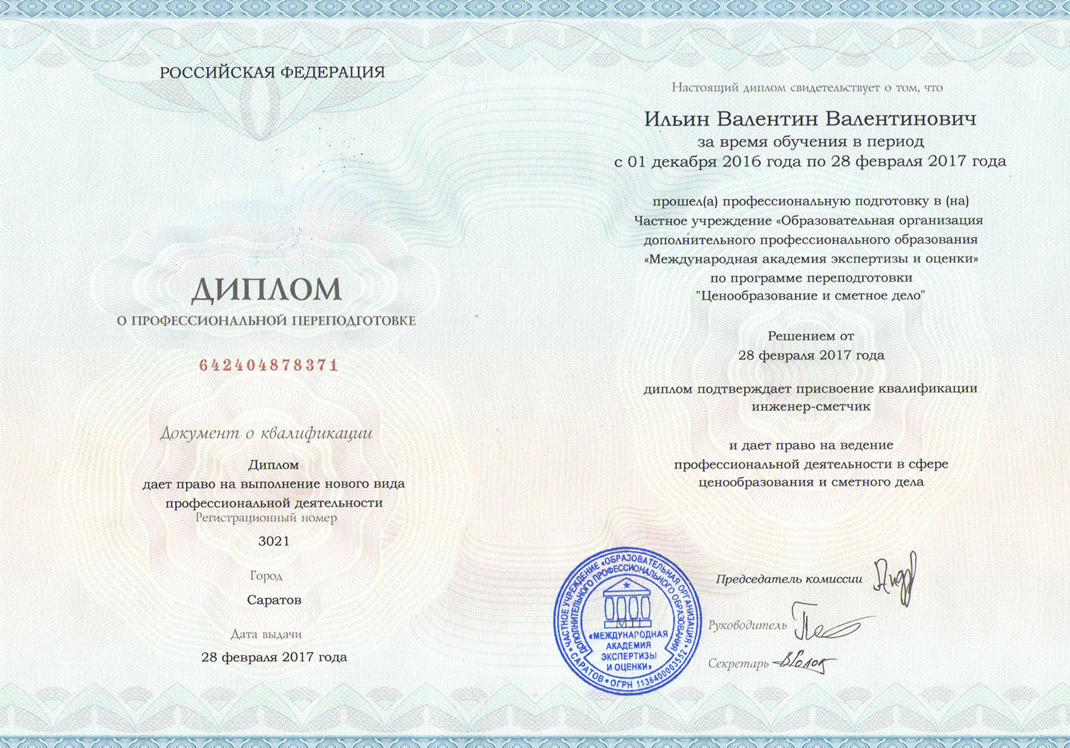 Член Международной Палаты Оценщиков, Гильдии Профессиональных Экспертов и Оценщиков,
